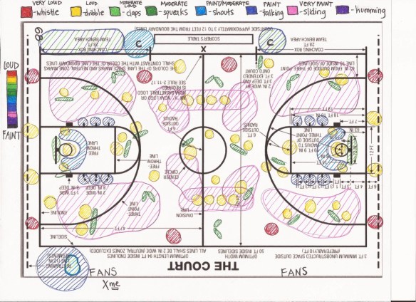 A soundmap is a visual representation of sounds in a certain place. A basketball game is a very dynamic and stimulating experience. I decided to visually map out the sounds of the in-game acoustic experience, with a general overview of where each sounds occurred and their loudness. There are layers of sounds : some continuous, rhythmic sounds like the sneakers squeaking and ball dribbling, underneath the sporadic, disruptive sounds like clapping, whistling, and shouting. Nevertheless, the rhythm of the game is constantly changing and the mood can be determined according to the soundscape. When things are calm and the players are talking their time, there is a slow, consistent dribbling sound like a metronome. But when the pressure is on, the game livens up, as do the sounds – faster dribbling and more shouting.